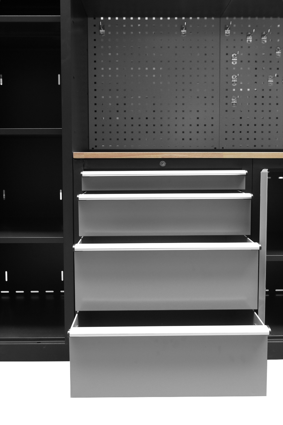 Серо-черный шкаф, легко содержать в чистоте, ящики на жестких направляющих, все двери запираются, ящики с замком на центральный ключ.< /п>