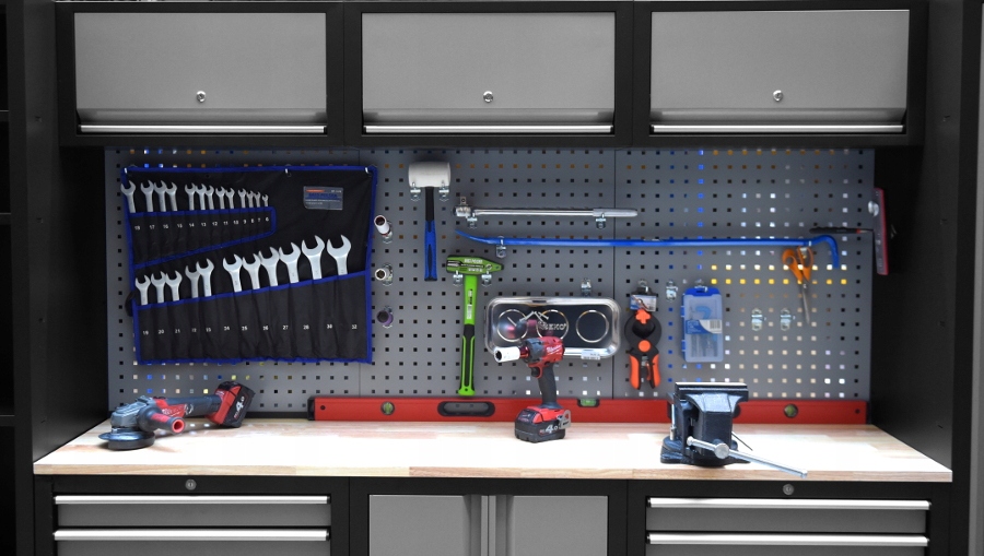 Профессиональная полка для мастерской из стали с порошковым покрытием, со столешницей из твердой деревянной.