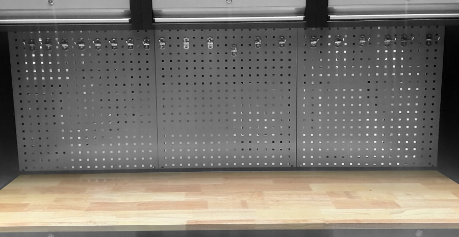 В комплект входит 20 крючков, благодаря которым мы можем повесить инструменты на решетку над столешницей.