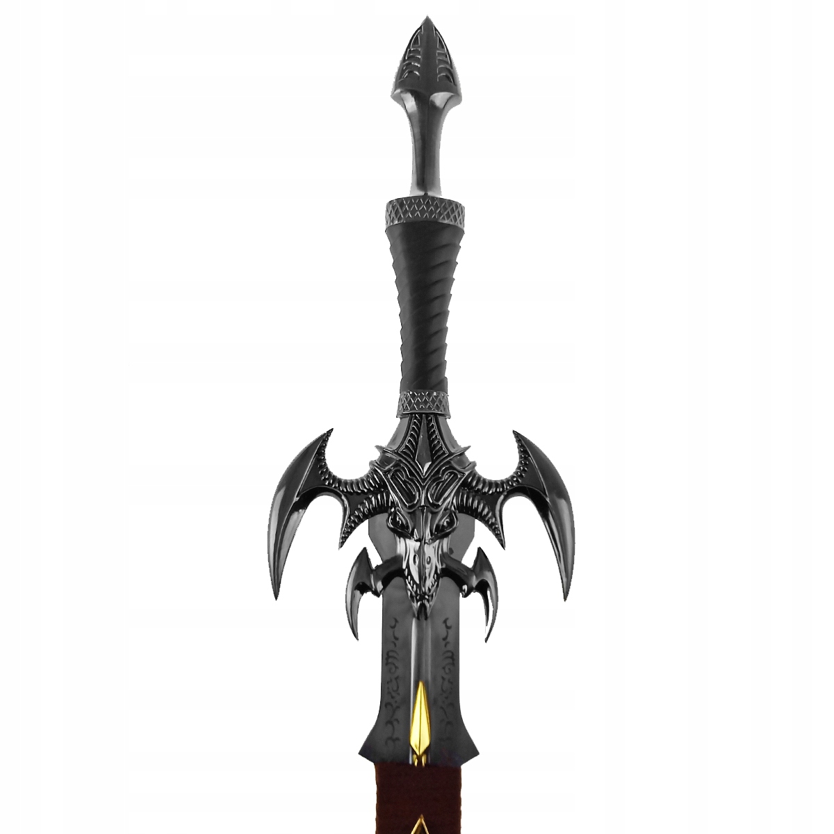 Меч темного эльфа "Exotath" полностью изготовлен из высококачественного из нержавеющей стали . Благодаря своему дизайну 1: 1 он напоминает оригинальный шаблон , и его стильный фэнтезийный дизайн поймает вас и не отпустит. Просто, зеркальное лезвие измеряет все 76,5 см . Его лезвие является тупым, потому что это чисто выставочный элемент . На лезвии вы найдете декоративные изображения и коски с коричневой кожей имитацией