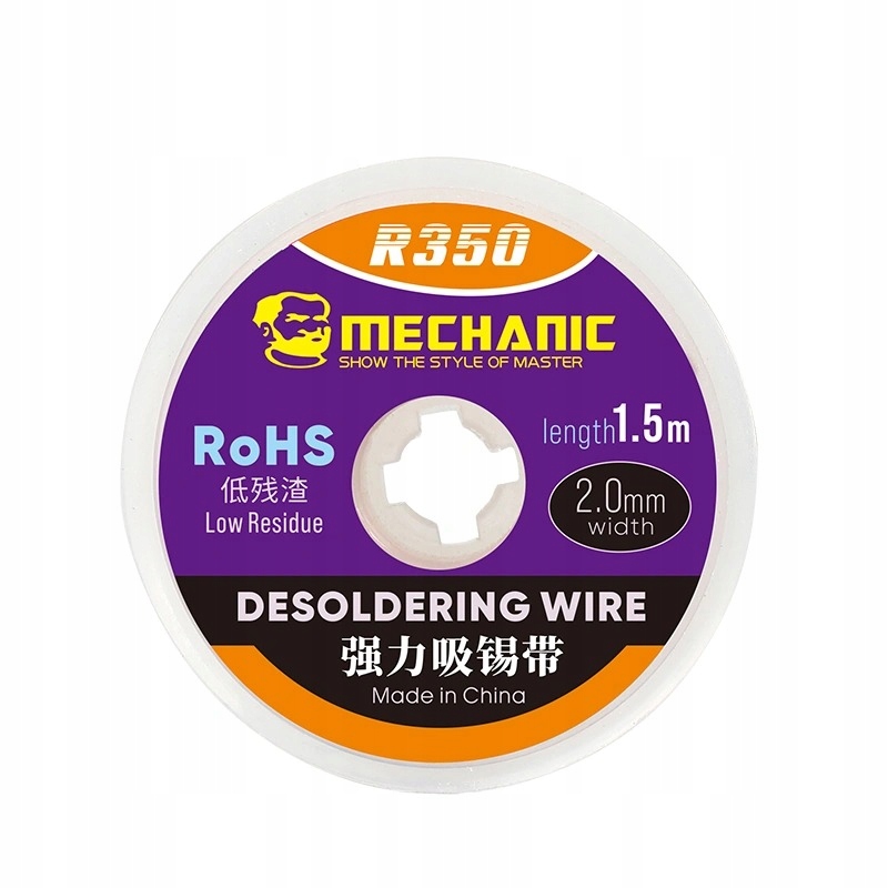 Mechanic R350-2015 – высококачественный продукт, используемый для удаления излишков олова при пайке и распайке. Эта широко используемая оплетка используется специалистами по ремонту электроники и любителями электроники своими руками.