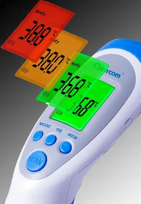Бесконтактный термометр Berrcom JBX-182 оснащен большим ЖК-дисплеем, который подсвечивается тремя цветами: