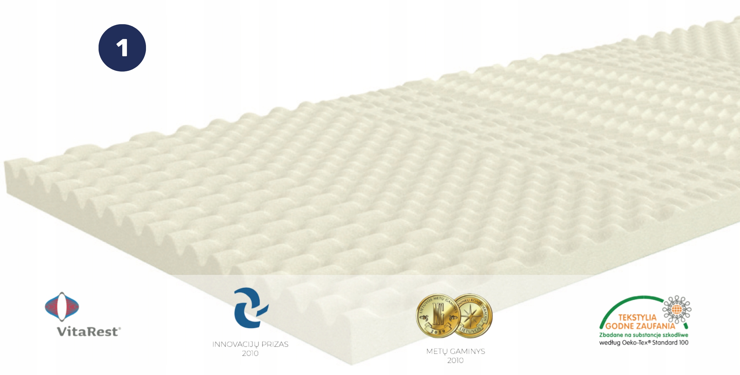1) Пена VitaRest (бежевая), расположенная на слое высокоэластичной пены, зеленой пеной обращенной вверх, обеспечивает очень хорошее прилегание и облегание тела.