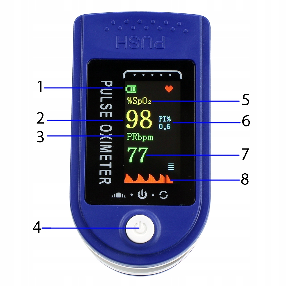 Пульсоксиметр — это современный, неинвазивный и, прежде всего, безболезненный способ измерения сатурации, частоты сердечных сокращений по скину. После надевания пульсоксиметра на палец инфракрасный светпроникает в кожу, благодаря чему прибор может автоматически измерять параметры и отображать полученные результаты на цветном дисплее< /б>. Все, что вам нужно сделать, это поместить устройство на палец и нажать кнопку ВКЛ/ВЫКЛ. После завершения исследования и удаленияпальца устройство автоматически выключится.