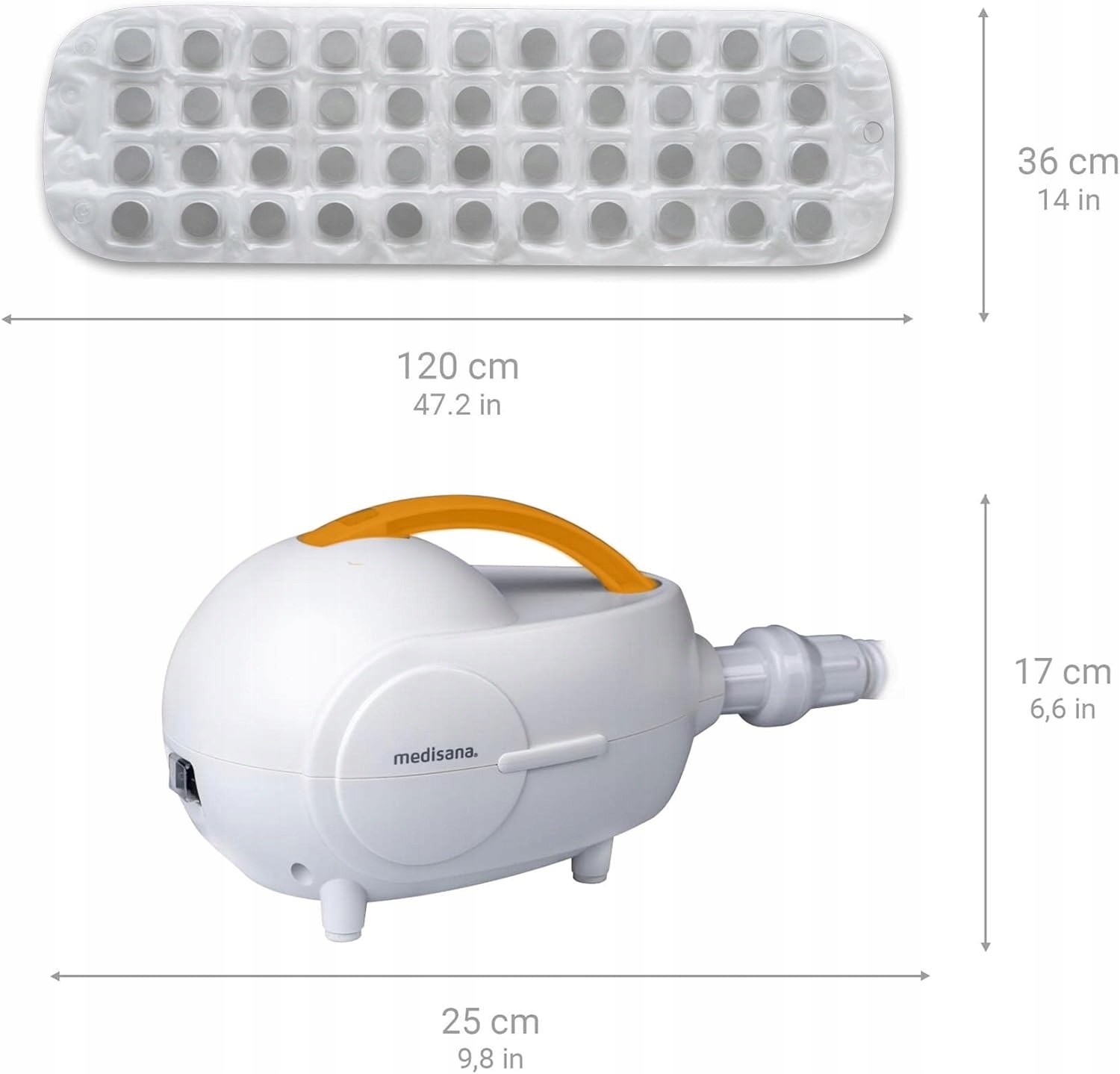 - Weight of the device: 2.7 kg Set: Medisana MBH 88375 bubble massage mat, power supply unit with a network cable, air hose, pilot with a suction cup and CR2032 battery, aromatic oil dispenser - 3 pcs, user manual