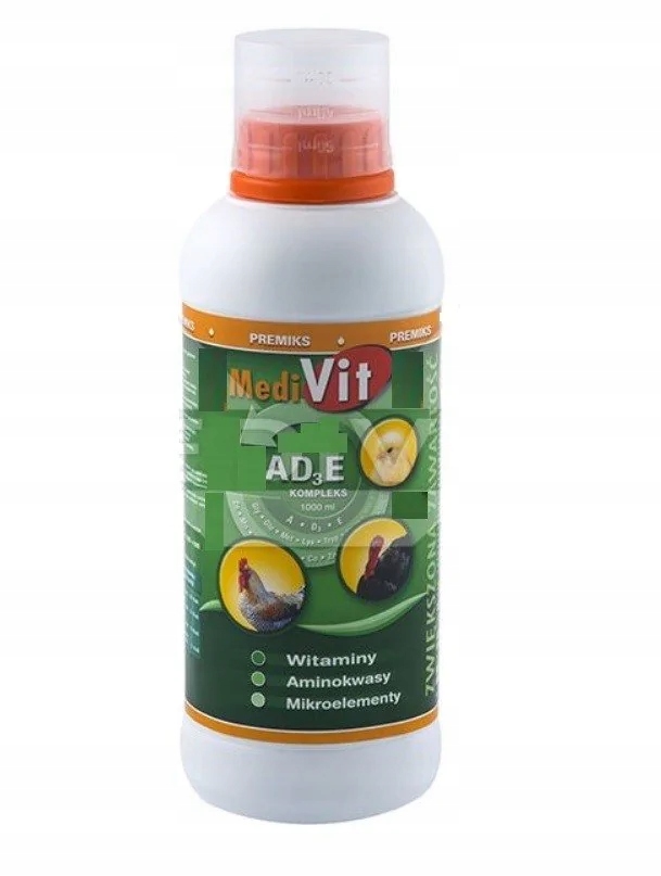 MEDIVIT AD3E — это продукт, который повышает общий иммунитет организма и восполняет повышенную потребность в витаминах у молодых и развивающихся животных. Препарат улучшает репродуктивные процессы. У кур-несушек увеличивается яйценоскость и улучшается качество яиц. Снижает ущерб в стрессовых ситуациях (транспорт, смена корма, болезни, плохие погодные условия и т.д.)