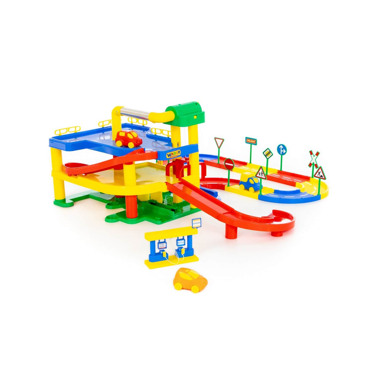 Место, где наш маленький водитель найдет все необходимое для ухода за своим автомобилем. № ГАРАЖА. 1 С ПУТЬЮ от ПОЛЕСЬЯ ВЕЙДЕР – игрушка для требовательных детей и родителей. Комплекс представляет собой трехуровневое здание с парковочными местами и выходами, защищенными шлагбаумами. Также здесь есть дополнительные станции, которые разнообразят веселье наших детей. Есть автомойка, где губки вращаются во время мытья автомобиля. Просто поверните ручку на специальном циферблате. Имеется автомастерская, оборудованная лифтом и мини-заправка с двумя колонками. Также имеется лифт, благодаря которому малыш может перевозить машину снизу вверх и наоборот. Открывающийся шлагбаум у одного из въездов в гараж – еще один подвижный элемент, который нельзя было пропустить. В набор входят три автомобиля. Игрушка изготовлена из качественного пластика. Это очень важный аспект, гарантирующий долговечность и безопасность использования. Мы можем быть уверены, что каждый элемент парковки останется на своем месте во время игры. Продукт совместим с остальной частью серии."