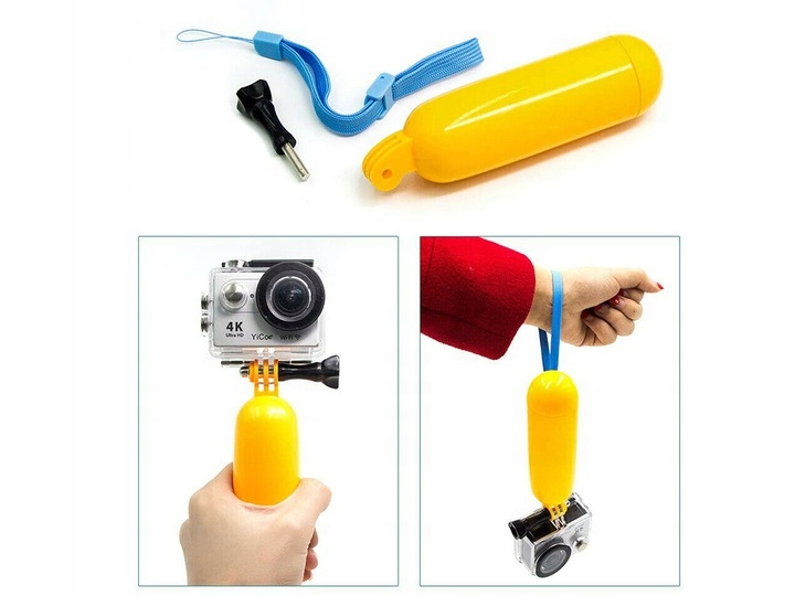 Держатель позволяет надежно и удобно удерживать камеру, тем самым сводя к минимуму нежелательные вибрации. Благодаря специфической конструкции буя камера не утонет, если выпадет из рук, а яркий цвет позволяет быстро ее найти.