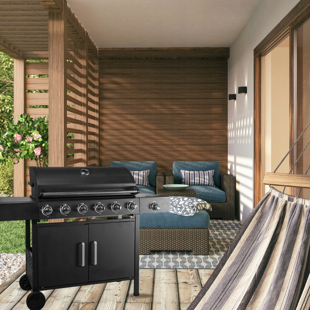 Gas Grill имеет до 6 Main горелки из нержавеющей стали, которых достаточно для приготовления пищи для большой группы людей. Благодаря Automatic зажиганию, горелки можно включить одним движением запястья. На горелках есть отвлекающие факторы, которые обеспечивают защиту во время использования. Газовый гриль можно легко удалить и очистить. Чтобы обеспечить дополнительную гигиену и удобство, газовый гриль также имеет съемный жирный поднос .