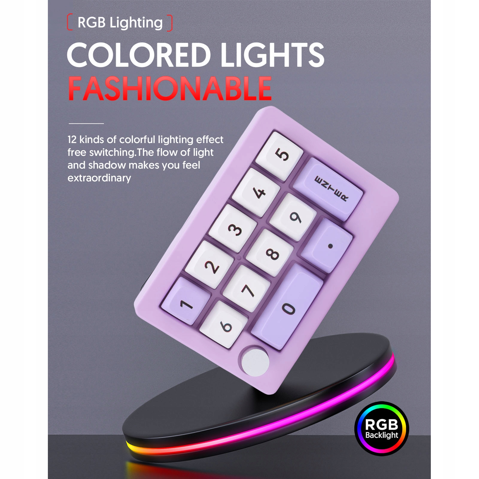 4. 12 светодиодных RGB-подсветок: эта цифровая клавиатура с RGB-подсветкой предлагает до 12 режимов подсветки. Нажмите клавишу в верхнем левом углу, и вы сможете изменить эффект освещения одним щелчком мыши. Нажатие переключателя режимов позволяет переключаться между рабочим режимом и игровым режимом. В рабочем режиме подсветка выключена и клавиатура выполняет функцию цифровой клавиатуры. После включения игрового режима она служит клавиатурой для программирования макросов.