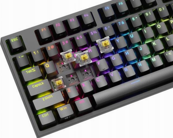 - другие особенности: система HOT SWAP, позволяющая заменить переключатели самостоятельно (можно установить любой 3- или 5-контактный переключатель | Высокая культура работы благодаря неплавающей (закрытой) конструкции клавиш и звукоизоляции под печатной платой | компактный размер TKL | тихие, линейные przełączniki z фабричное смачивание Gateron Yellow PRO | фабричные смарочные стабилизаторы | дополнительные накладки на ключи с технологией подсоединения PBT | с настройкой RGB: доступно 18 попыток подсвечение + возможность программирования без ничего | (металлическая пластина zapewnia wytrzymałość na długie лет) |. двухступенчатые регулируемые ножки с резиновыми поверхностями