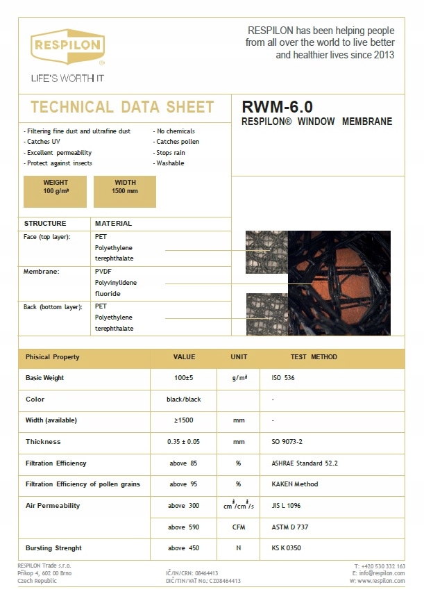Уникальная фильтрующая способность мембраны обеспечивается слоем нановолокон, замкнутых внутри мембраны. Технически оконная мембрана RESPILON представляет собой трехслойный ламинат, содержащий дышащую сетку и слой нановолокон. Тканевые элементы, используемые в мембране, стерилизуются против УФ-излучения. Компактность обеспечивается за счет ламинирования материала. Оконная мембрана RESPILON подходит для использования в домах аллергиков, астматиков, а также людей с сердечно-сосудистыми заболеваниями и заболеваниями легких, проживающих в районах или регионах с повышенным уровнем загрязнения воздуха.