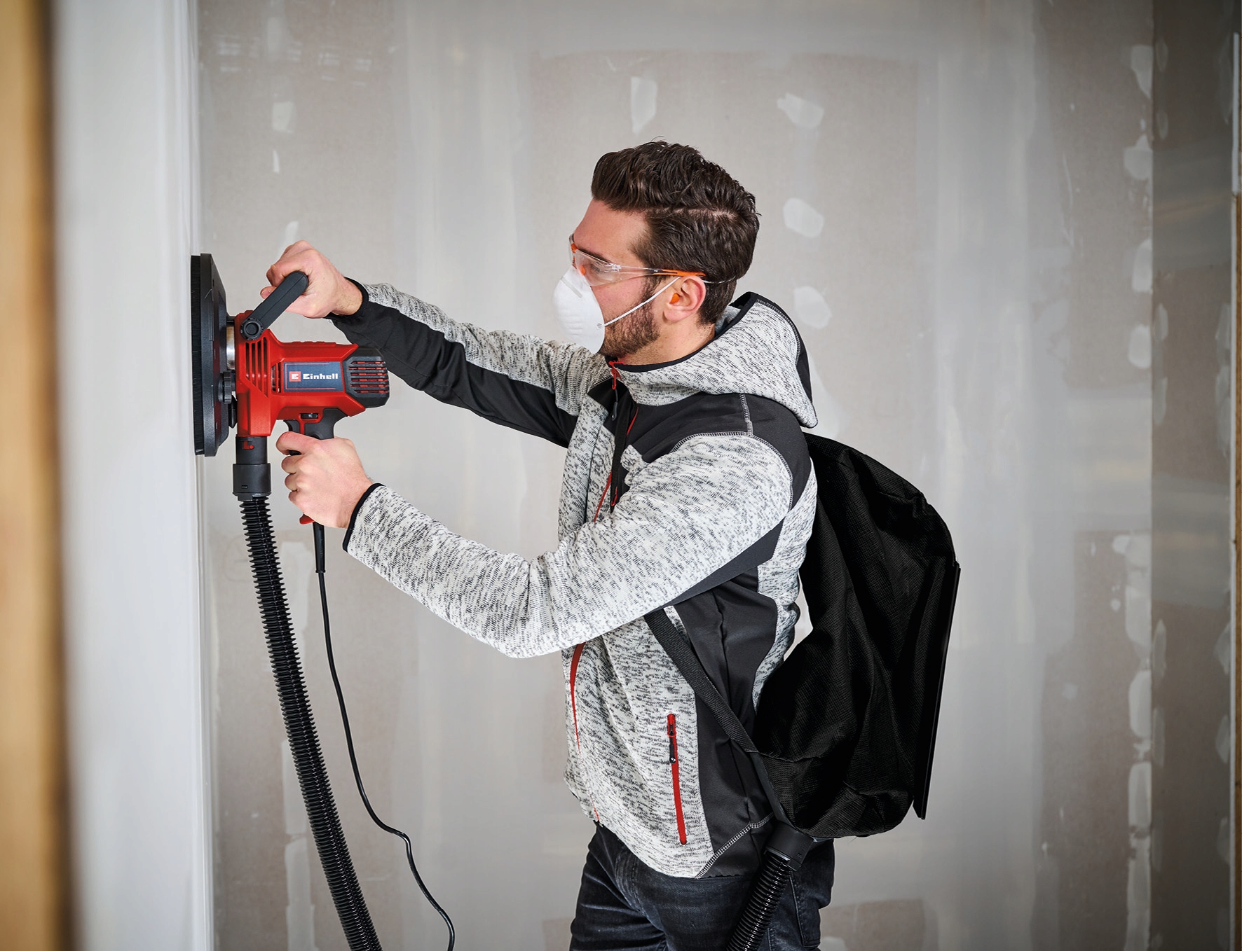 является идеальным партнером для ремонтных работ с мощностью 1220 Вт. Сетевой кабель длиной 4 метра поможет отшлифовать гипсокартонные стены, остатки шпаклевки или обоев по всей комнате. В зависимости от области применения или материала скорость шлифовального диска можно регулировать от 1500 до 2300 об/мин с помощью скоростной электроники с функцией плавного пуска, а переключатель с кнопкой блокировки обеспечивает непрерывную работу устройства. Благодаря двум мягким ручкам – основной и дополнительной – шлифовальная машина для гипсокартона Einhell хорошо лежит в руке и позволяет безопасно и комфортно работать. Встроенный пылеотвод обеспечивает чистоту рабочей зоны и крепится к входящему в комплект пылесборнику с помощью ремня для переноски с помощью всасывающего адаптера диаметром 35 мм и всасывающего шланга длиной 2 м. Край кольца щетки можно снять с подпружиненной шлифовальной пластины, обеспечивая оптимальный контакт со стеной или потолком. 6 кусочков наждачной бумаги разной зернистости (2x P60, P80, P120) можно легко и быстро прикрепить к шлифовальному кругу с помощью застежки-липучки.