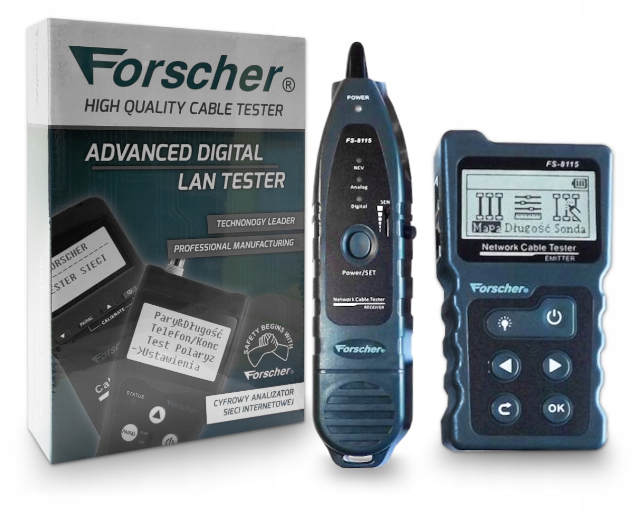 Тестер интернет-сети FS8115 используется для измерения непрерывности кабеля, измерения длины проводов и измерения расстояния до места повреждения. Позволяет измерять ошибки подключения в витых парах UTP/STP. . Позволяет проверить жгут кабелей локальной сети на целостность, отсутствие или наличие коротких замыканий, а также целостность пар проводов. Также тестер имеет функцию измерения напряжения на отдельных проводах кабеля (POE) и определения стандарта POE AT A. Функция «Найти порт» позволяет быстро найти порт в сетевом устройстве. Кроме того, FS8115 оснащен усовершенствованным детектором пар проводов с двумя режимами работы: аналоговым и цифровым.