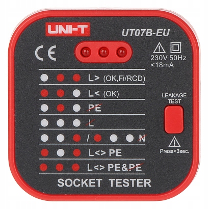 ut-07b-eu-тестер указывает на правильность соединения L, N, PE в электрическом розетке, он также имеет функцию проверки эффективности дифференциальных и токовых выключателей RCD и тока