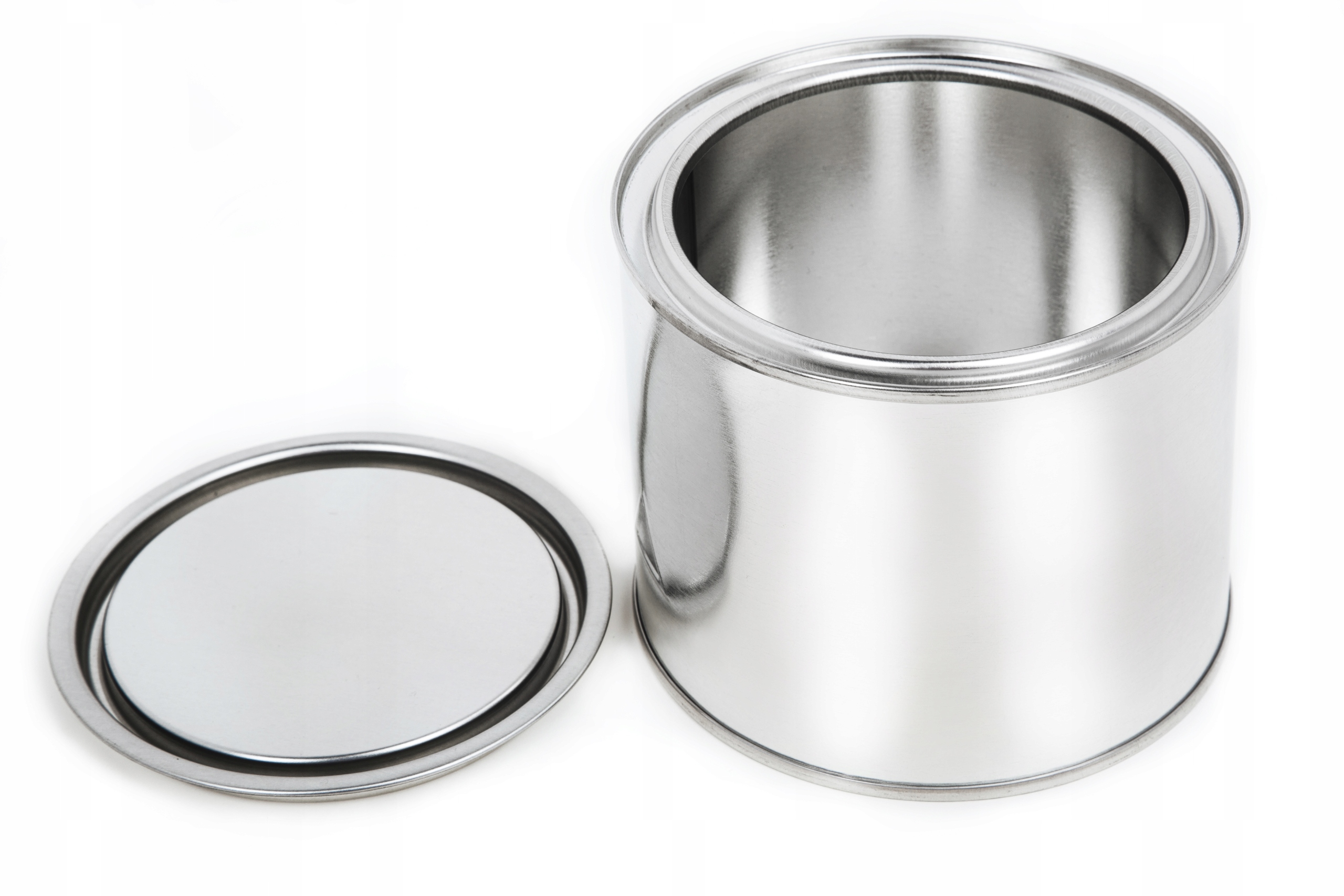 Пустая металлическая банка (жестяная банка) с крышкой - для хранения жидких и твердых химических веществ, таких как краски, лаки, шпаклевки, замазки, смолы и т.п.