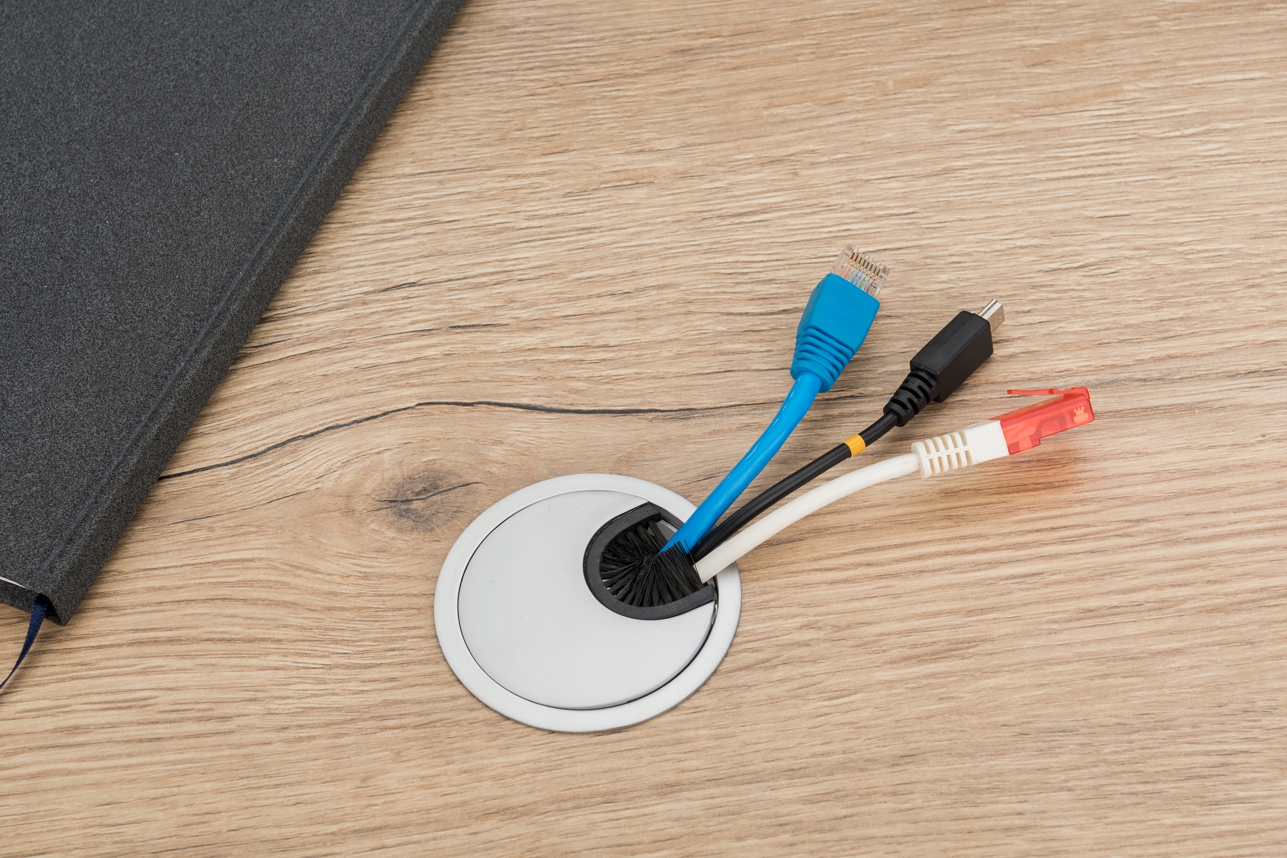 Использование сквозного отверстия позволяет элегантно использовать пространство и защищает кабели от трения о края столешницы.