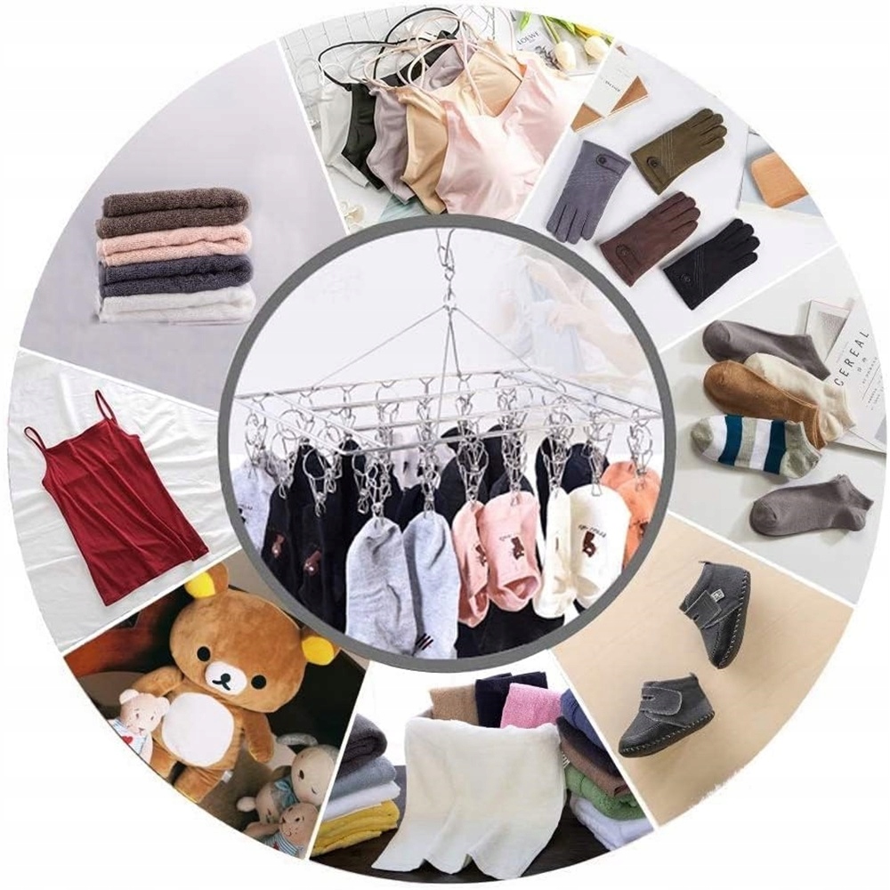 С этой сушилкой для белья с зажимами вам никогда не придется беспокоиться о том, что у вас закончатся вешалки или не хватит места! Эта сушилка для носков, предназначенная для сушки на веревке, идеально подходит для сушки множества мелких вещей в доме. Вешалка с 36 зажимами занимает минимум места на полу, а ее прямоугольная форма упрощает хранение.