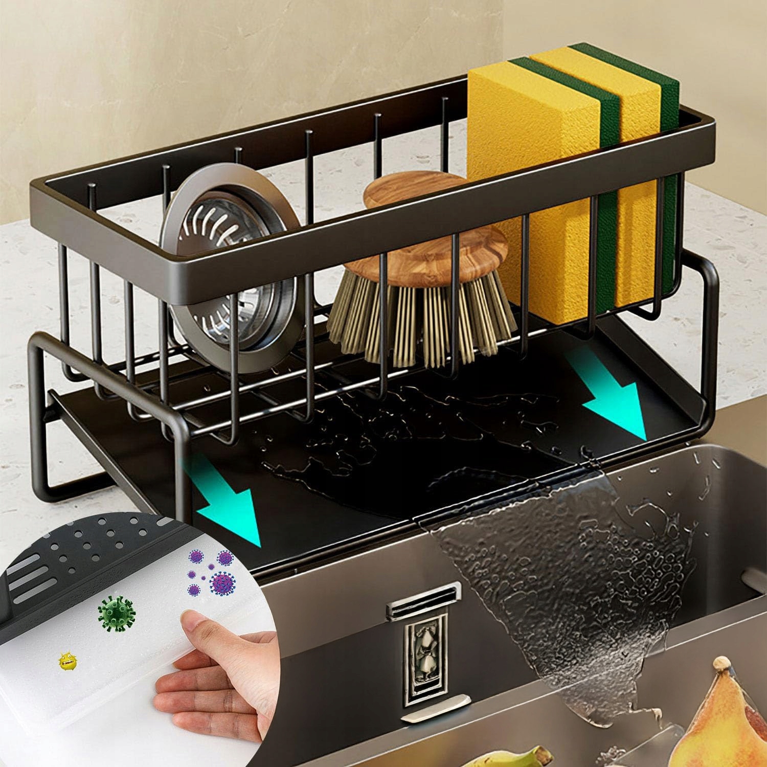 ✨ Автоматическая система слива – Благодаря продуманной конструкции органайзер самостоятельно сливает лишнюю воду в раковину. Вам не придется опорожнять контейнер вручную – ваша кухня останется сухой и чистой!