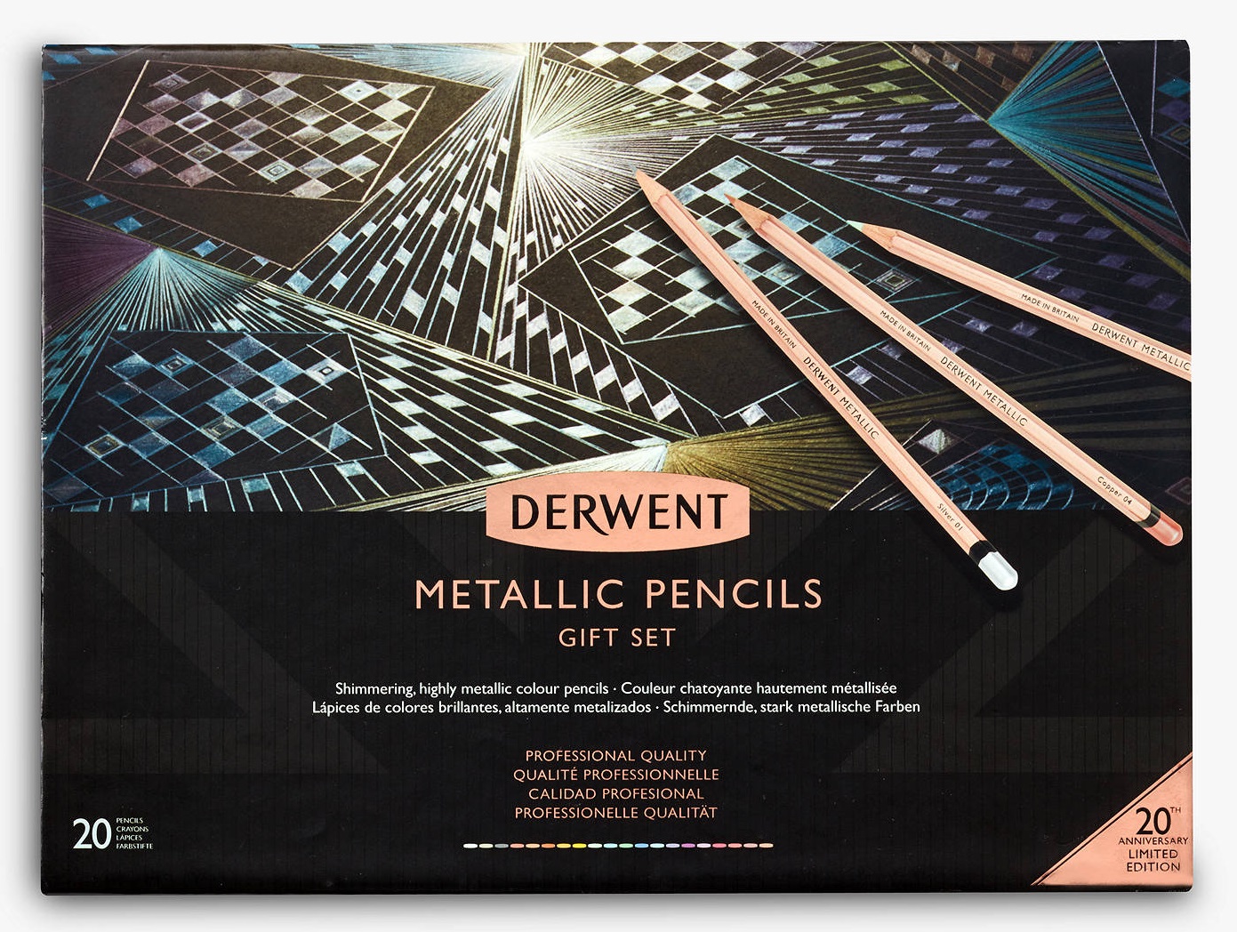 Высоко -качественное, металлическое рисование карандашей " Metallic " Английская компания derwent сделана на основе превосходных пигментов, связующего и деревянного рамы. Отражая свет, они легко смешиваются, создавая яркие и поразительные вспышки, особенно на черной бумаге.