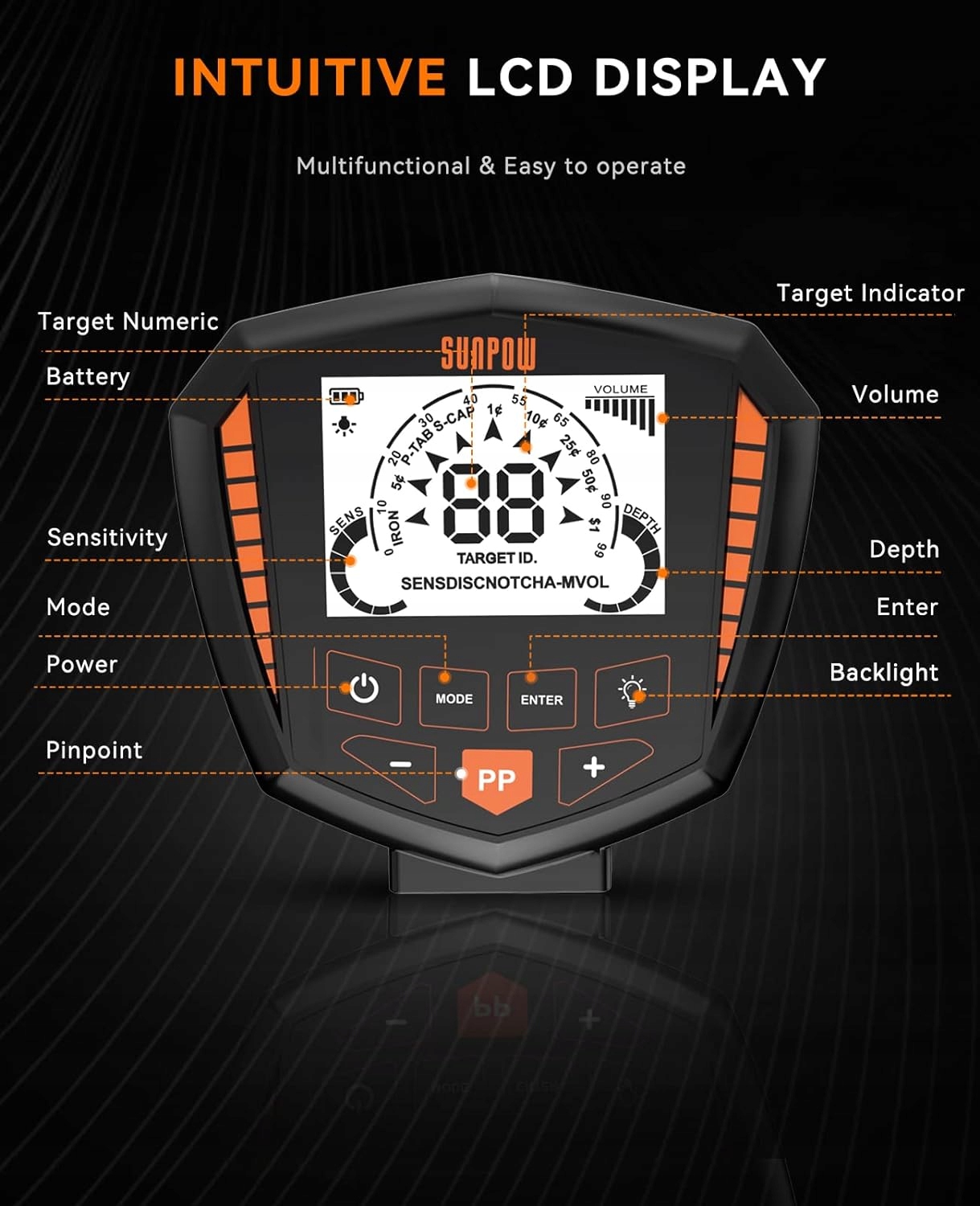 [Интуитивный ЖК-дисплей высокой четкости] Металлоискатель Sunpow имеет интуитивно понятный ЖК-дисплей, легко считывает 9 металлических значков, точное значение обнаружения, режим, громкость, чувствительность, глубину и т. д. Подсветка позволяет гибко работать в темноте. 3 метода идентификации (цифровой, изображение, звук) позволяют легко определить тип металла.