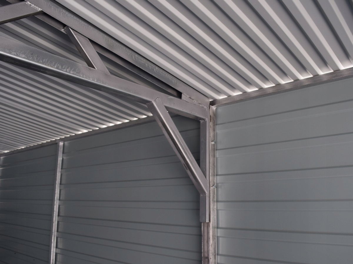 Гараж из листового металла шириной 7,00 м (6,97 м) и длиной 6,00 м (5,97 м). 2 подъемно-поворотные ворота с ГОРИЗОНТАЛЬНЫМ тиснением из листового металла (ширина тиснения около 20 см). Высота входа 1,94 м. Двускатная крыша, общая высота вверху 2,65 м, высота боковых стен 2,13 м. Акриловый лист - под дерево: стены, отливы и желоба ТЕМНЫЙ ОРЕХ, ворота ТЕМНЫЙ ОРЕХ, крыша BTX8017 темно-коричневая матовая. Листовой металл крепится к конструкции с помощью заклепок, соответствующих цвету листового металла. Конструкция стены усилена закрытыми оцинкованными профилями 30х30. КУЗОВ в цвете ТЕМНЫЙ ОРЕХ. Стены из листового металла Т-7 в ГОРИЗОНТАЛЬНОМ расположении.