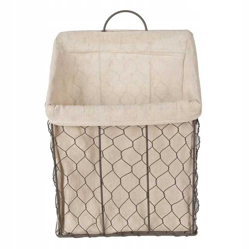 Декоративная железная корзина коричневого цвета в деревенском стиле с бежевой тканевой (льняной) подкладкой. Общие размеры корзины: 23х10х37 см. Высота переда 21 см, высота спинки 33 см, высота с петлей 37 см. Размер петельки для подвешивания 8х3 см. Корзина для хранения