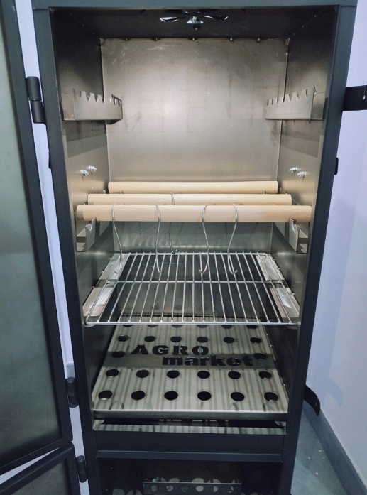 ➕ между камерами существует извлеченное наложение, регулирующее равномерное распределение дыма в коптильнике.