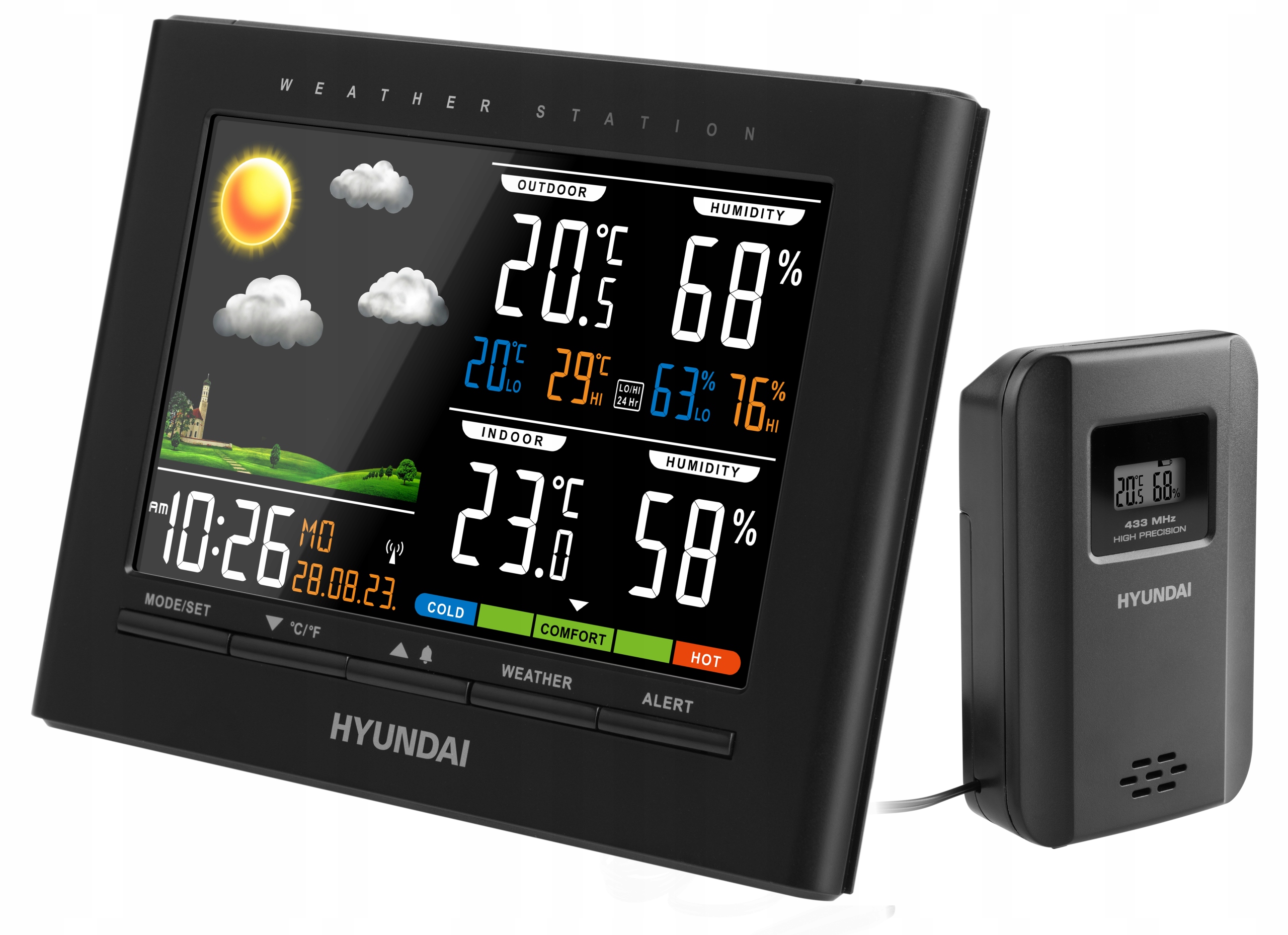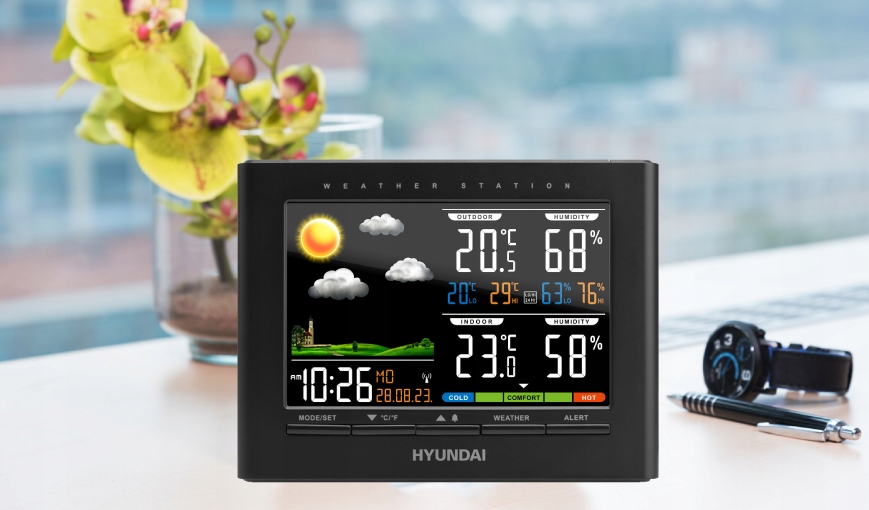 Метеостанция Hyundai станет вашим ежедневным советчиком. На цветном ЖК-дисплее можно сразу проверить не только текущую температуру наружного воздуха и влажность воздуха, но и прогноз погоды на ближайшие часы. Прогноз отображает в общей сложности 5 различных анимаций погоды, а именно: солнечно, переменная облачность, облачно, дождливо, морозно или снежно.