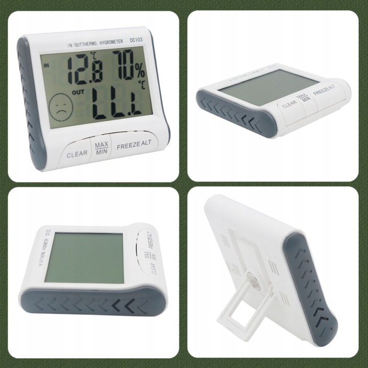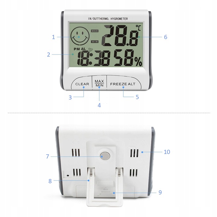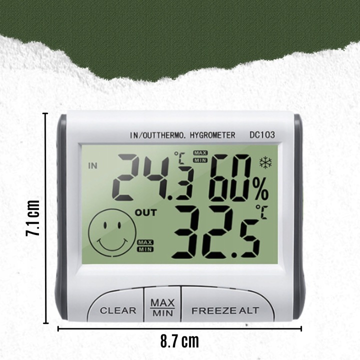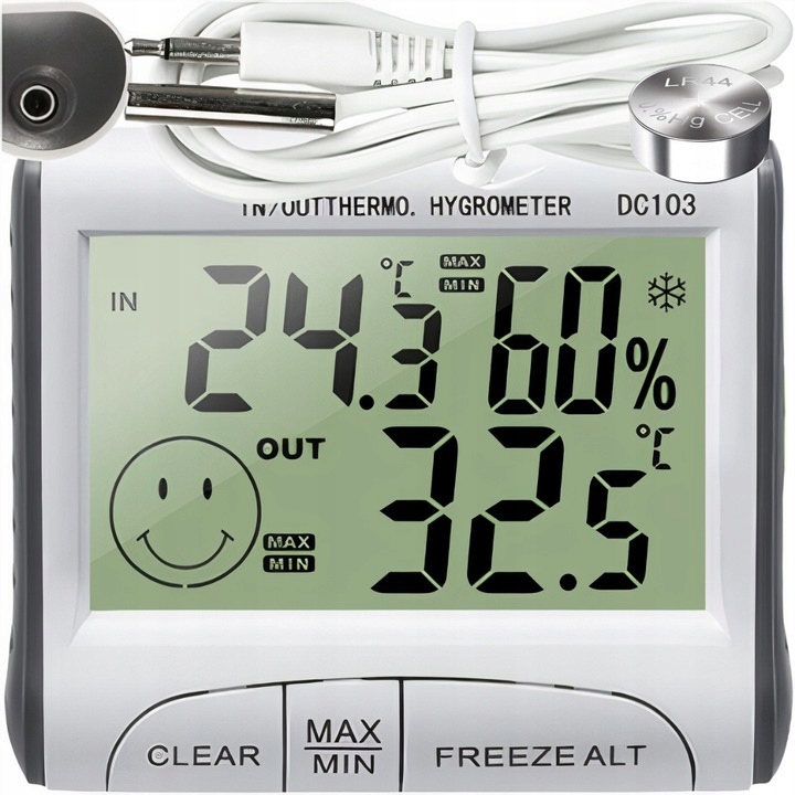 Изделие оснащено четким ЖК-дисплеем, на котором отображаются все значения. Есть функция сохранения и считывания самых низких и самых высоких значений в течение дня. Дополнительно на экране также отображается смайлик, который указывает, комфортны ли условия в помещении или нет. Возможно форматирование единиц температуры (градусы C/градусы F).