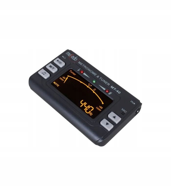 Метроном Musedo модель MT40 с дополнительными функциями тюнера и камертона. Устройство имеет четкий дисплей, 3 контрольных светодиода зеленого и красного цвета, вход для наушников на небольшом разъеме, большой вход для звукоснимателя, динамик и внутренний микрофон.