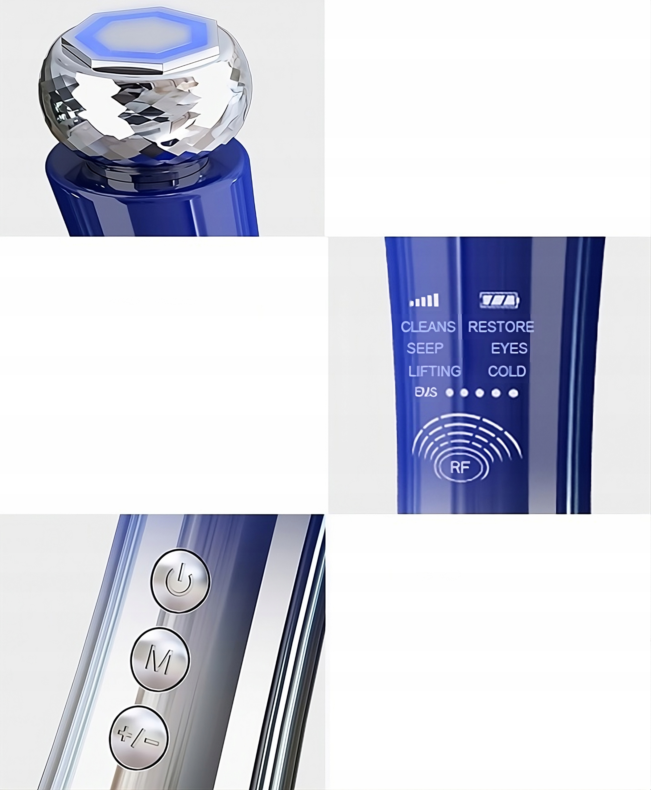 - 6 в 1: криотерапия, ионофорез, электростимуляция EMS, радиоволны RF, фототерапия (красный, синий, оранжевый), вибрация