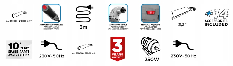 Прибор имеет шлифовальный башмак, пильное полотно по керамике, скребок, полукруглое пильное полотно по дереву и пластик, широкое погружное полотно и узкое погружное полотно.