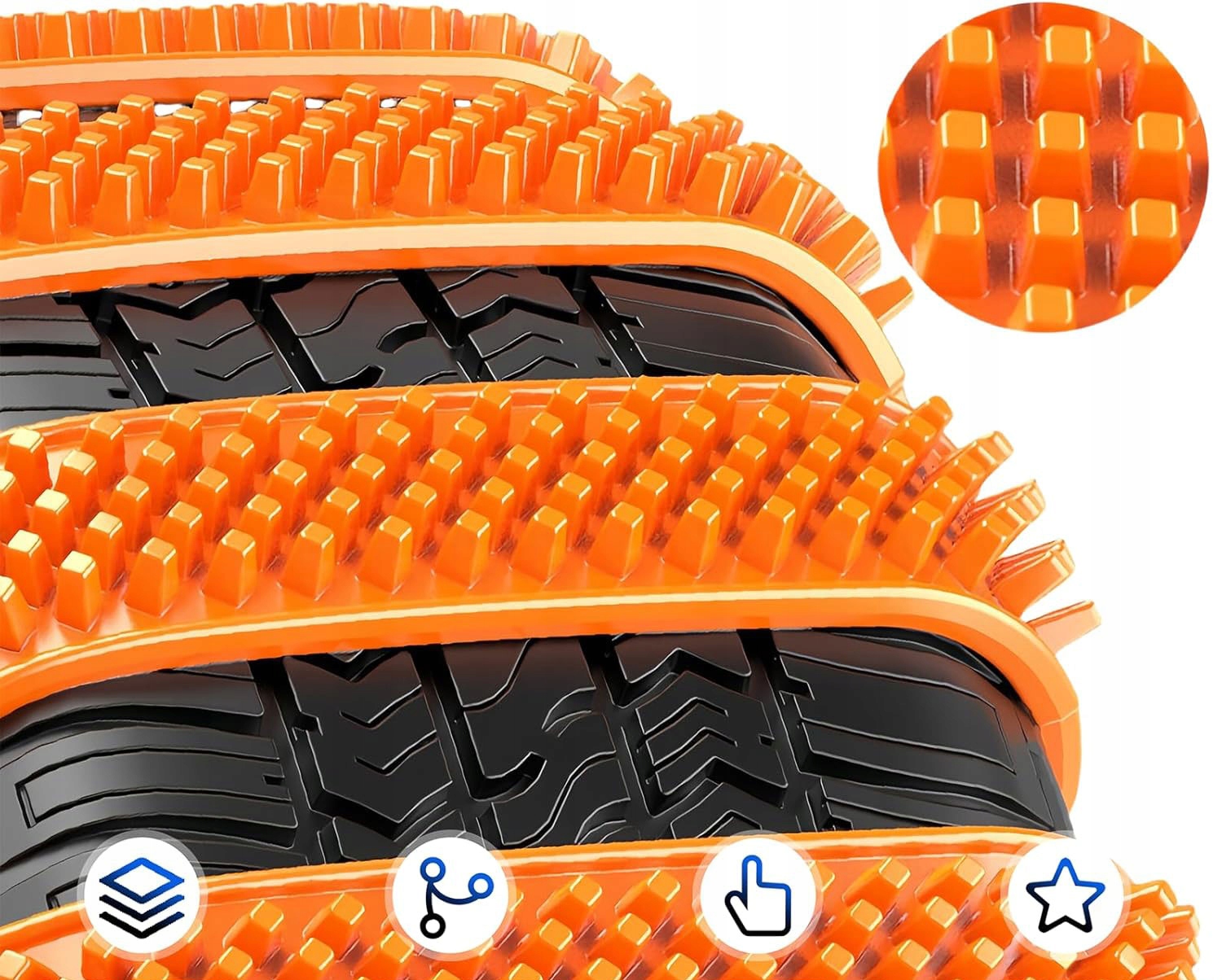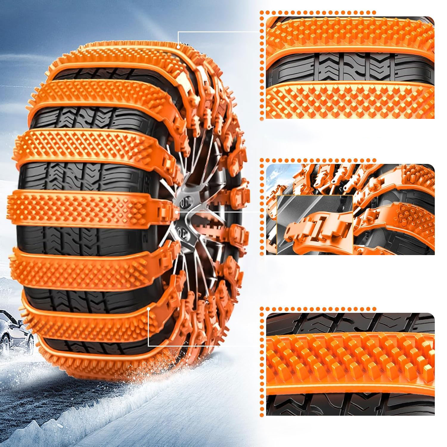 Весь комплект изготовлен из высококачественных материалов, что обеспечивает вашу безопасность во время вождения и длительное использование изделия. Цепи противоскольжения можно легко снять и хранить, не опасаясь повреждения. Комплект противоскользящих лент облегчит езду по заснеженным и грязным дорогам.