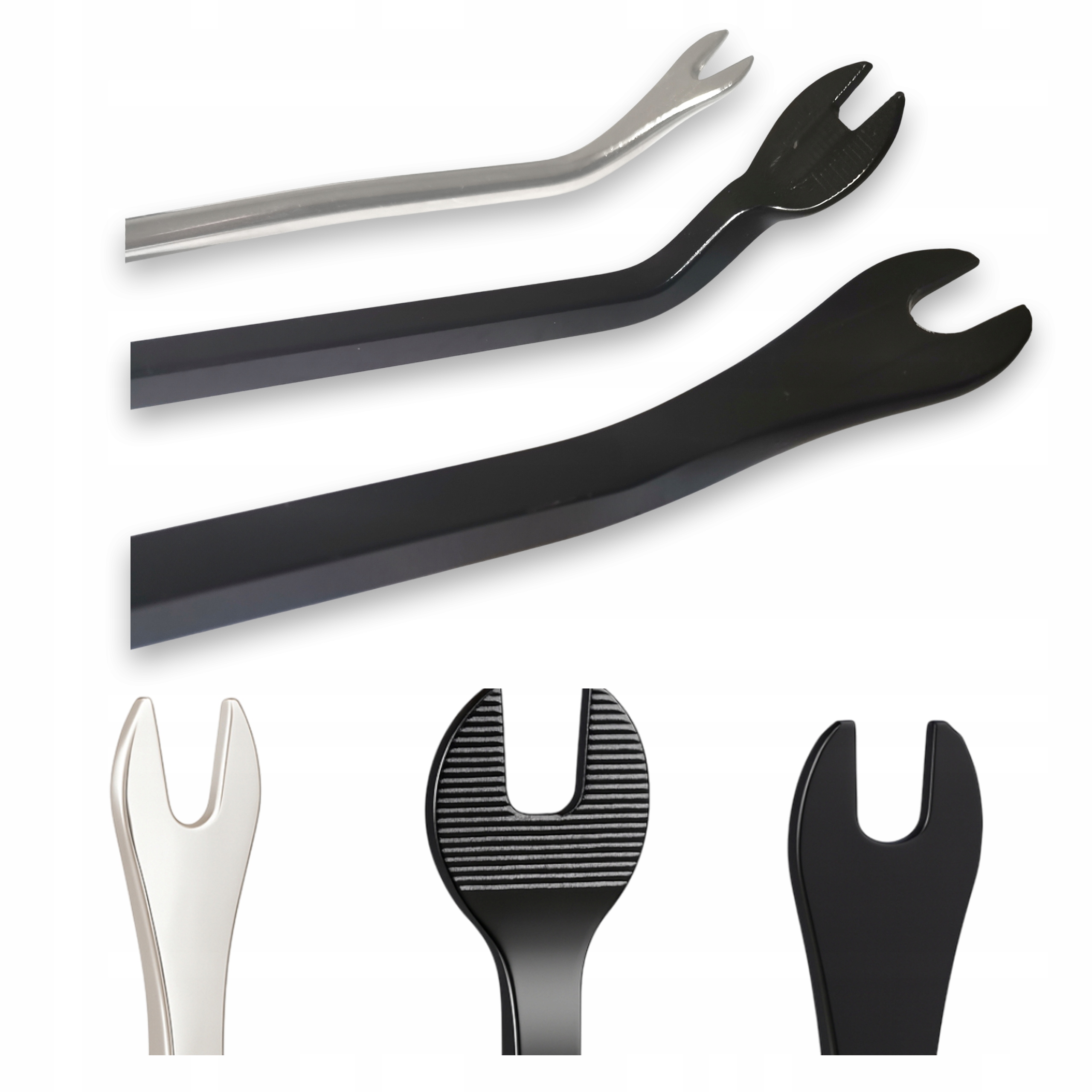 Набор состоит из трех ломов разного профиля и плоскогубцев, которые позволяют легко разбирать элементы обивки и пластиковые крепления.