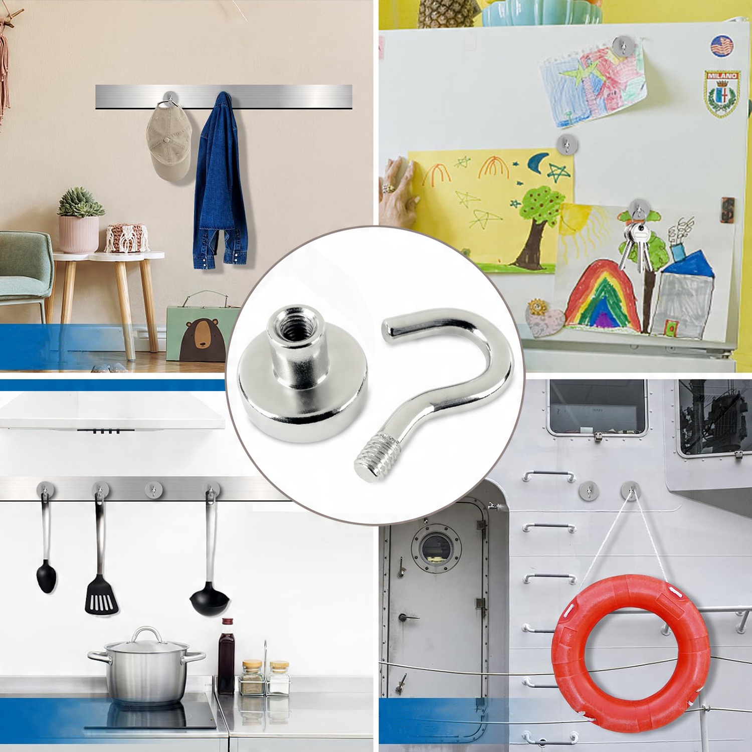 Набор сильных неодимовых магнитов с крючком для магнитных досок, холодильников и других применений дома, школы, офиса и мастерской.