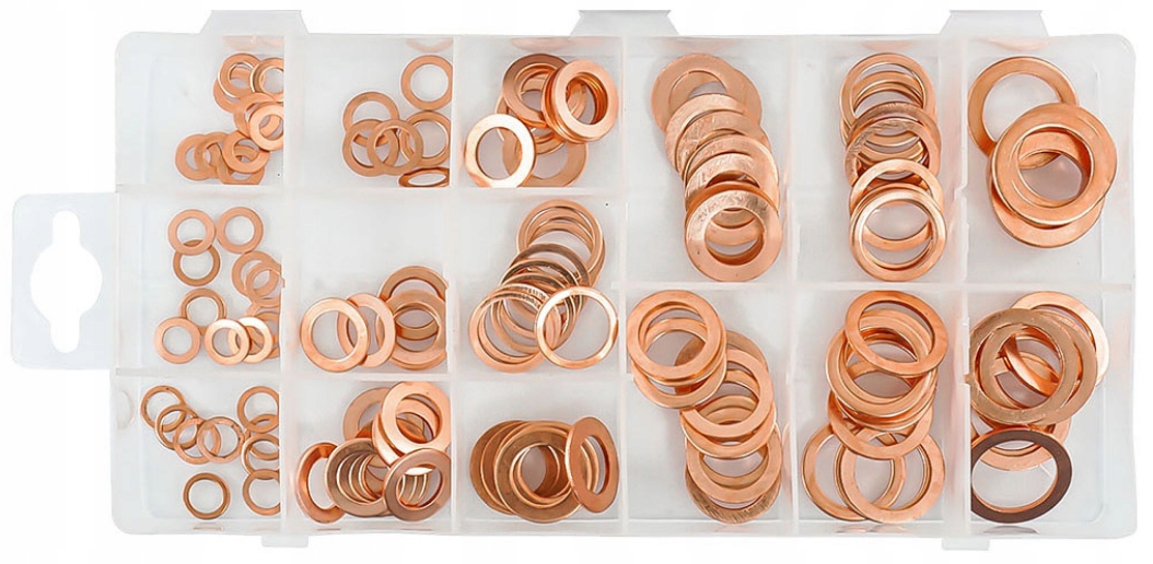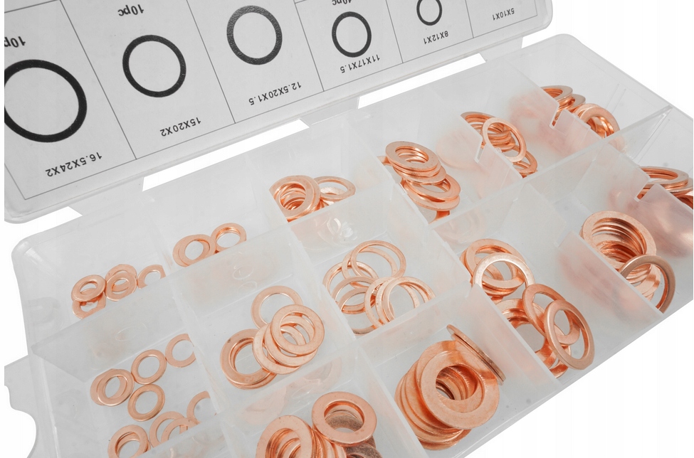 Набор медных прокладков для приложений для семинаров. Все упаковано в удобную пластиковую коробку с отсеками, обеспечивающими порядок и правильную сегрегацию размеров прокладки.