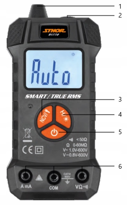 Универсальный интеллектуальный счетчик STHOR с символом 81772 с функцией TRUE RMS и автоматическим диапазоном для каждого измерения. Измеритель не только автоматически выберет диапазон измерения, но и самостоятельно определит, измеряем ли мы в данный момент сопротивление, целостность цепи, напряжение постоянного или переменного тока. Это делает использование счетчика очень простым. В стандартных счетчиках перед измерением мы должны сами установить соответствующий диапазон измерения и тип измерения. В этом счетчике после включения просто поместите измерительные щупы, например, на полюсы батареи, а затем считайте результат.