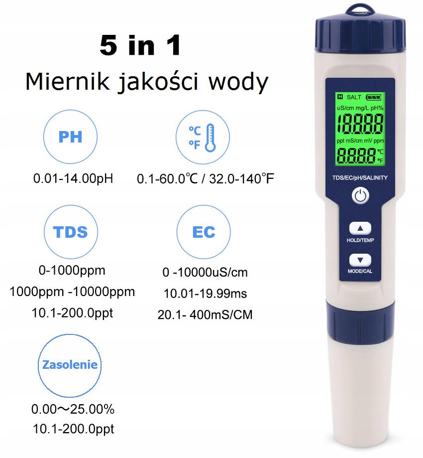 Miernik Combo 5IN1 pH/EC/TDS/SALINITY/Temp +bufory