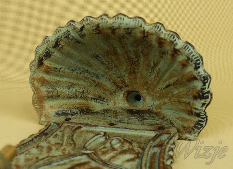 Чугунная настенная садовая раковина зеленого цвета с потертостями (патина), украшенная изображением коня.