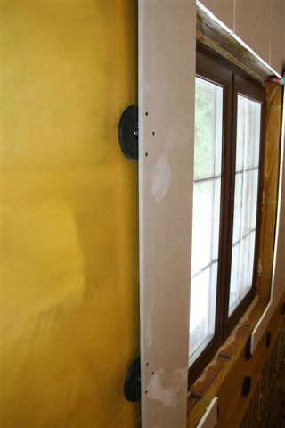 Ниже приведены фотографии, на которых показано прикручивание дистанционных стабилизаторов к стене (до прикручивания к ним гипсокартона).