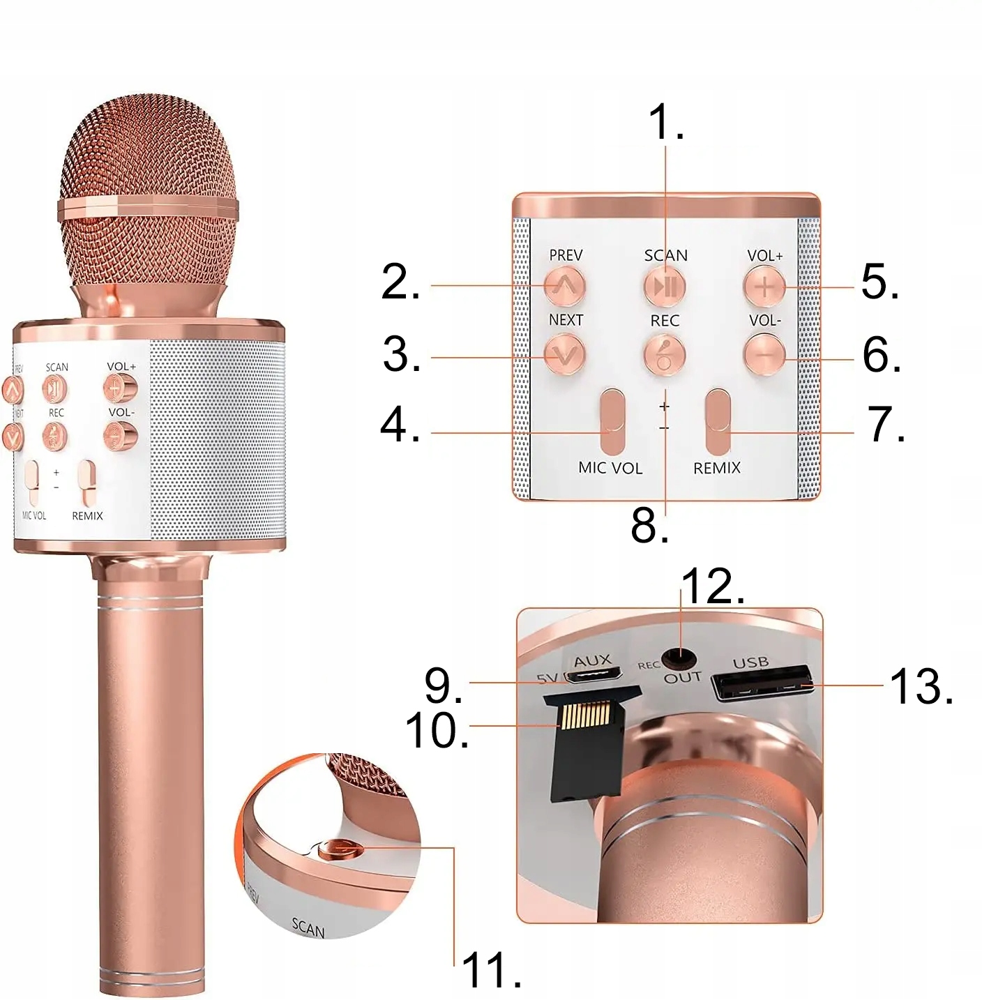 — просто включите микрофон, удерживая кнопку № 11, а затем с помощью ползунка № 4 установите громкость микрофона. После этого можно петь!