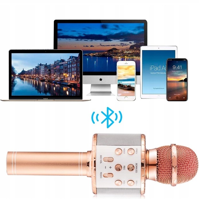 - наш микрофон работает со многими приложениями для караоке. Благодаря этому вы можете подключить микрофон к телефону через Bluetooth, затем записывать свое пение с помощью микрофона и воспроизводить записи с любимыми песнями.
