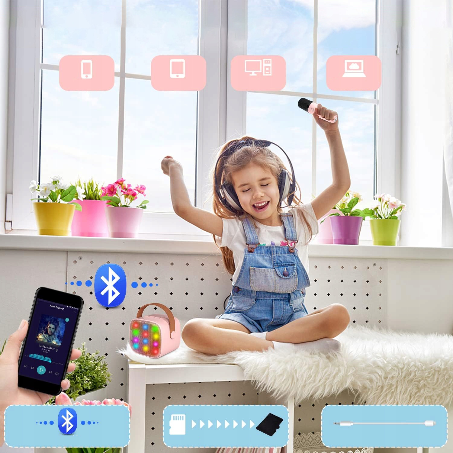 Дни рождения, встречи, занятия, занятия на свежем воздухе... этот портативный динамик Bluetooth и беспроводной микрофон удовлетворит все ваши потребности в «счастливом пении».