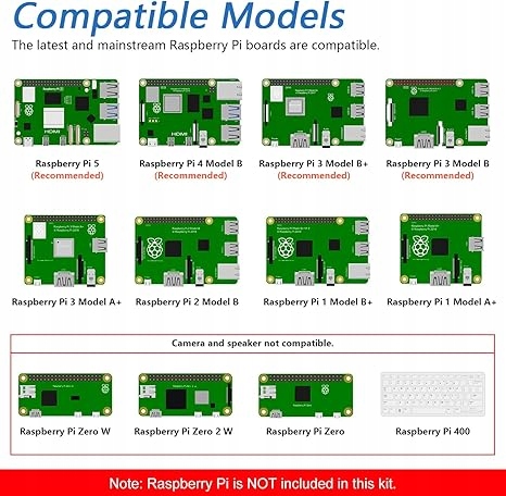 - Совместимые модели -> Raspberry Pi 5 / 400 / 4В / 3В+ / 3В / 3А+ / 2В / 1В+ / 1А+ / Ноль 2 Вт / Ноль Вт / Ноль. (Камера и динамик несовместимы с моделями 400 и Zero.)