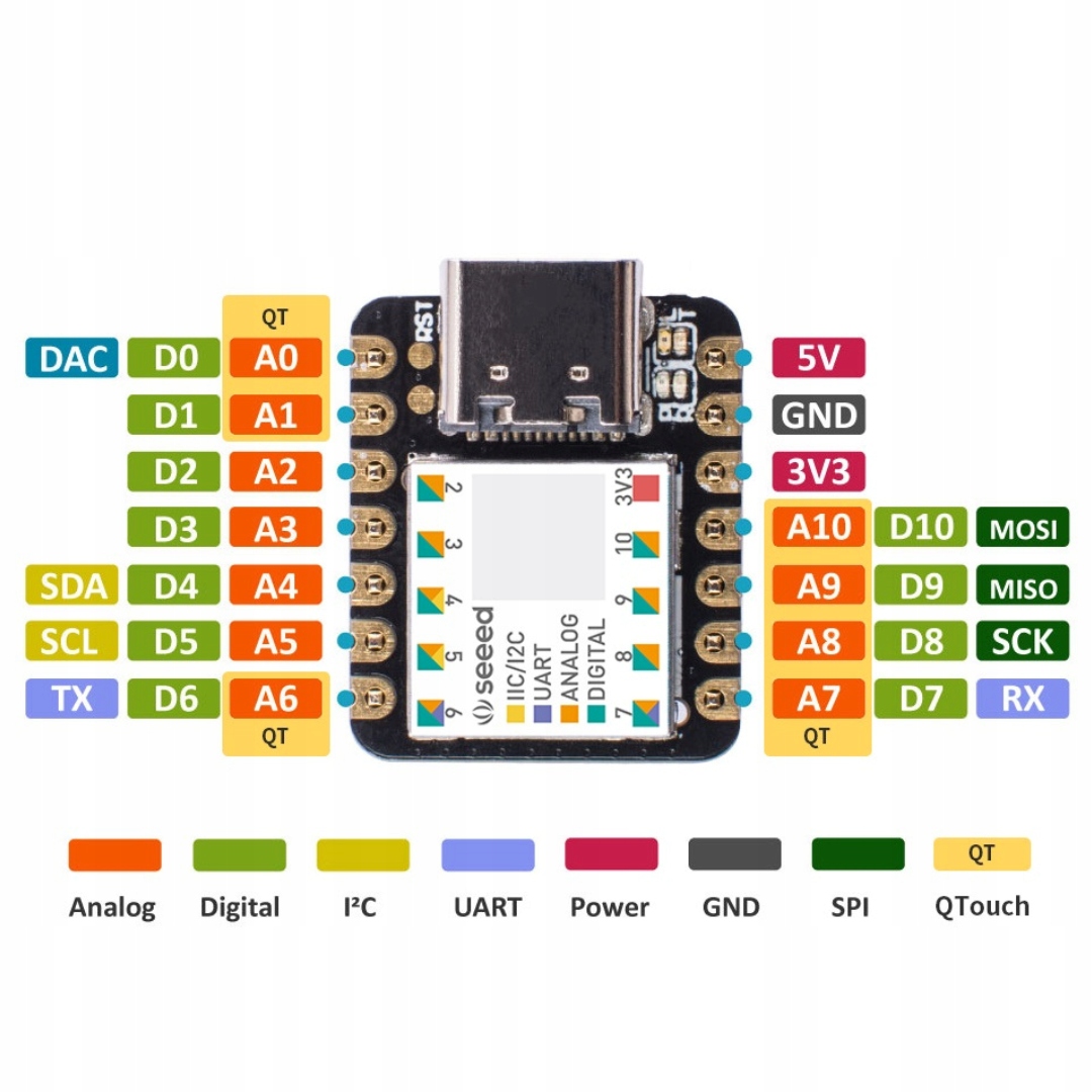 Seeeduino Xiao отличается разнообразием функций своих выводов: от A1/D1 до A10/D10 они поддерживают ШИМ, в то время как A0/D0 обеспечивает функцию ЦАП для генерации подлинного аналогового сигнала, а не ШИМ. Модуль использует разъем USB C для питания и программирования. На обратной стороне платы имеются площадки для подключения аккумуляторов. Плату можно программировать через Arduino IDE или PlatformIO. Он оснащен кварцевым резонатором 32,768 кГц для обеспечения стабильности системы.