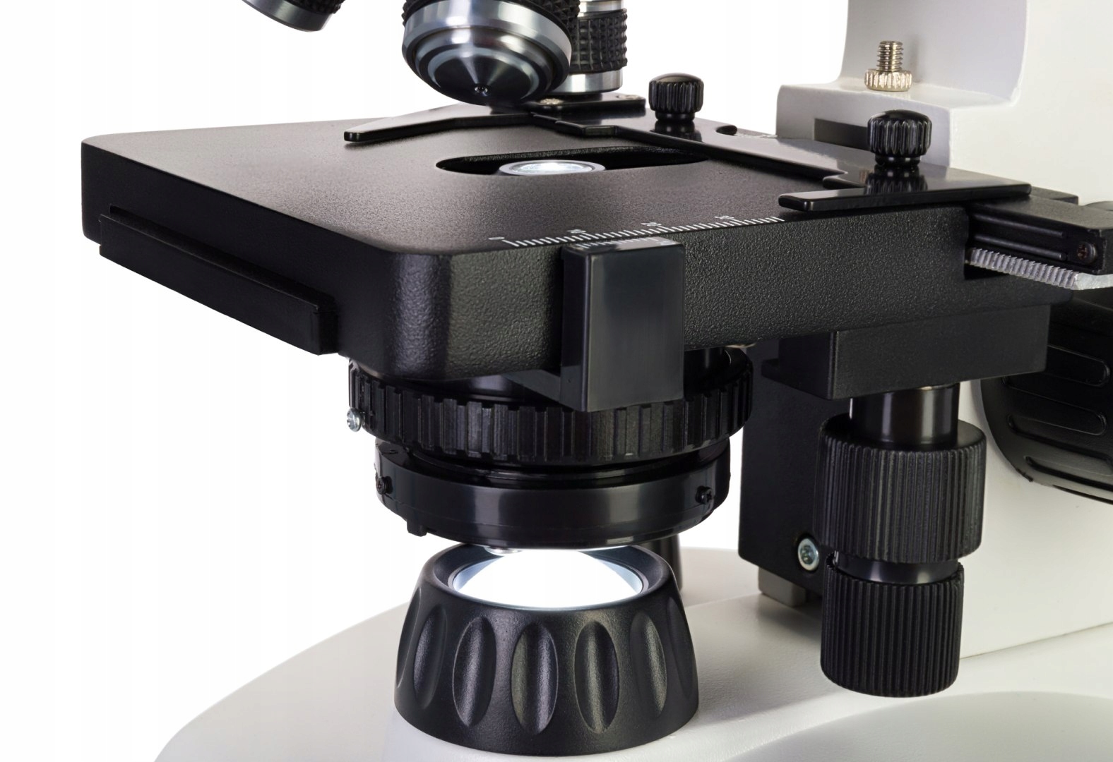 Предмет микроскопа имеет механическую шкалу, повышающую удобство использования. Под столом установлен конденсор Аббе с ирисовой диафрагмой и держателем светофильтра. Система освещения состоит из двух элементов: верхнего и нижнего освещения с регулировкой яркости. Освещение может работать от батарейок или сетевого адаптера (батарейки и блок питания входят в комплект).