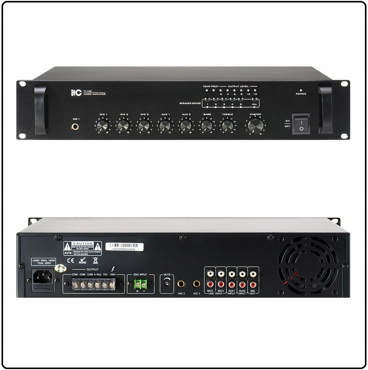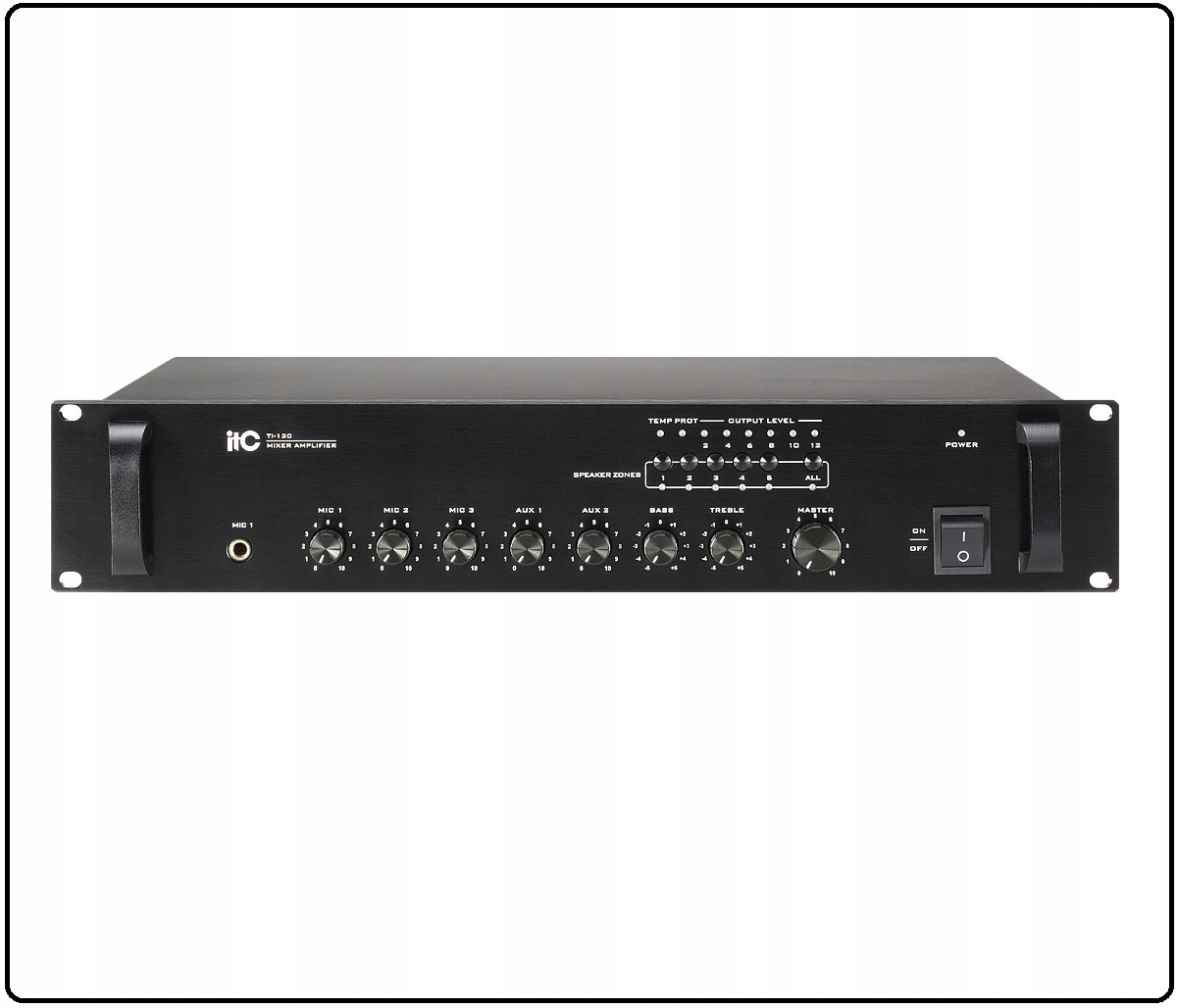 Модель TI-120 от ITC Audio — одна из лучших, передовые технически и технологически обоснованные решения, доступные на рынке в своем ценовом диапазоне. Пятизонный микшерный пульт оснащен 5 входами: 3 микрофонных входа, 2 линейных входа AUX и входом сигнализации ЭМС, которые вместе с MIC1 имеют приоритет над остальные входы. Уже упомянутые MIC и AUX имеют отдельные регуляторы звука — за бас и сопрано отвечают две отдельные ручки.