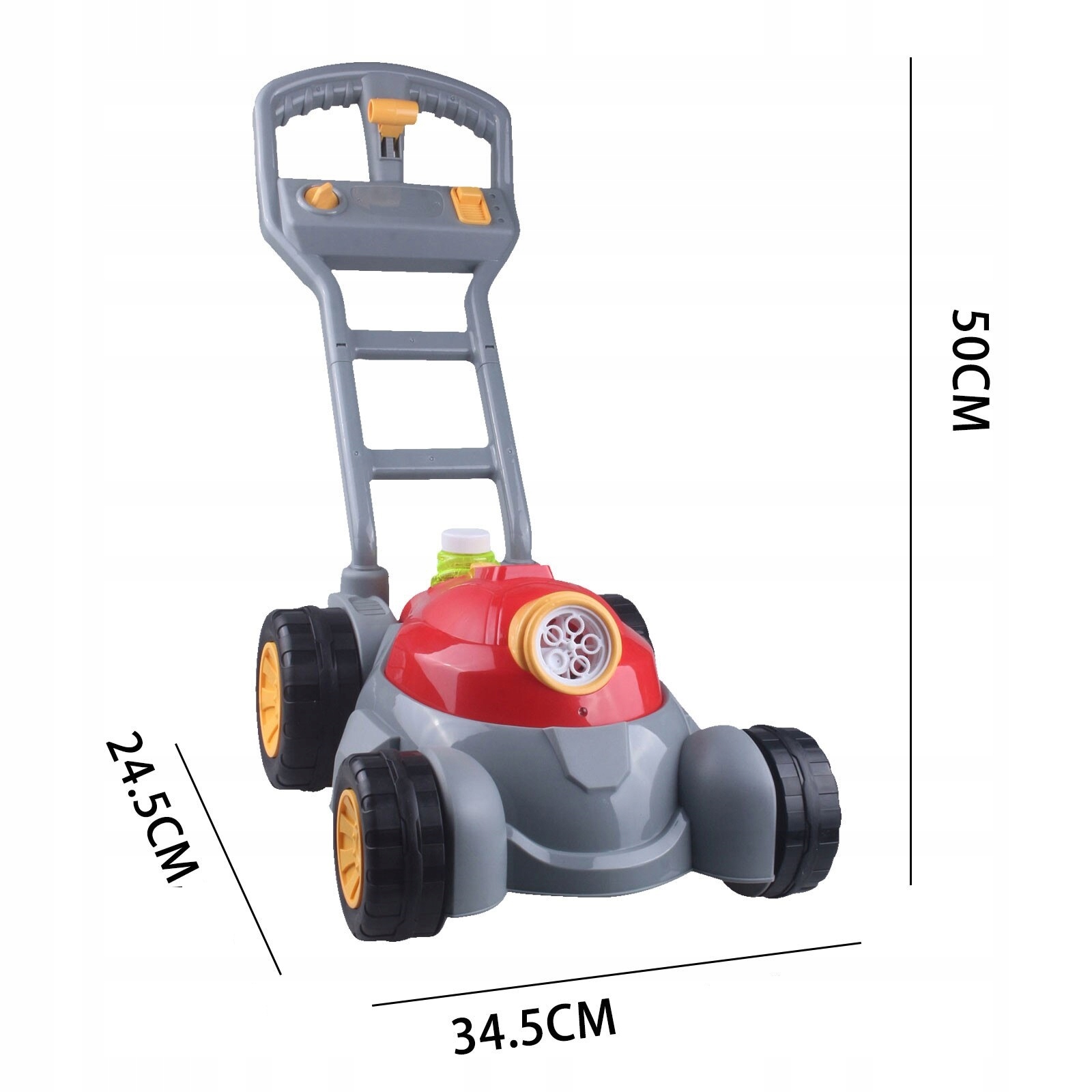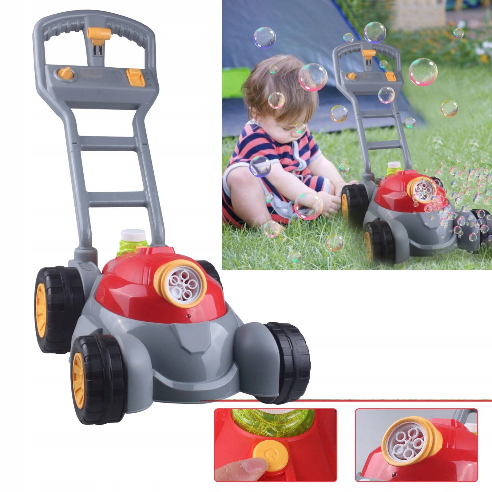 Игрушечная газонокосилка, пускающая мыльные пузыри, станет отличным подарком любому ребенку.