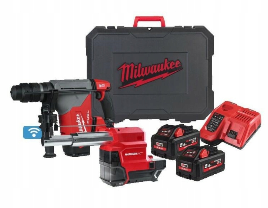 M18 FUEL™ 32-мм перфоратор SDS-Plus с 4 режимами Специальный пылесборник для молотков M18 FUEL™ 32 мм SDS-Plus с AUTOPULSE™ 2 батарейки M18 HB5.5 Зарядное устройство М12-18 ФК Чемодан Боковая ручка Остановка глубины Смазка Металлический держатель инструмента FIXTEC™ 13 мм